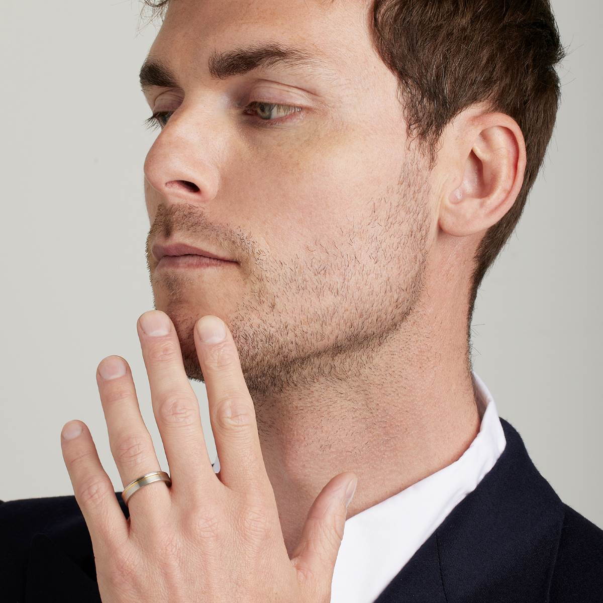 Une alliance de mariage à l'aspect contemporain pour homme ou femme. Bicolore, elle est composée d'une base en platine et d'un filet asymétrique traversant en or jaune 18 carats. De type ruban à la finition brossée et aux bords biseautés, cette alliance existe en 2 versions de largeur : 4 mm et 5 mm.