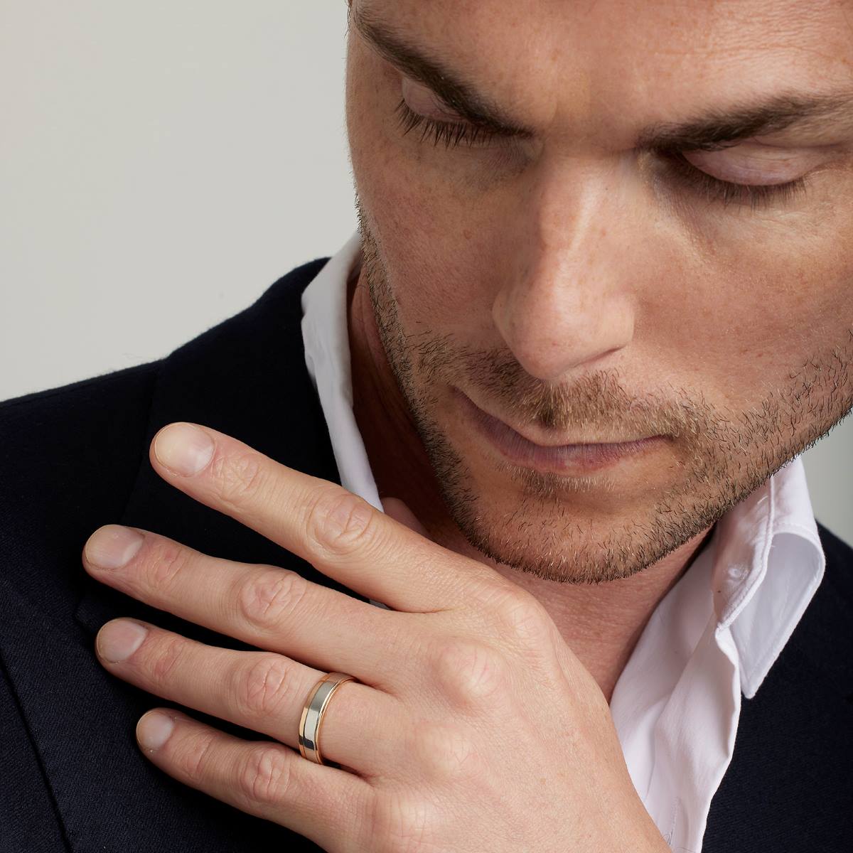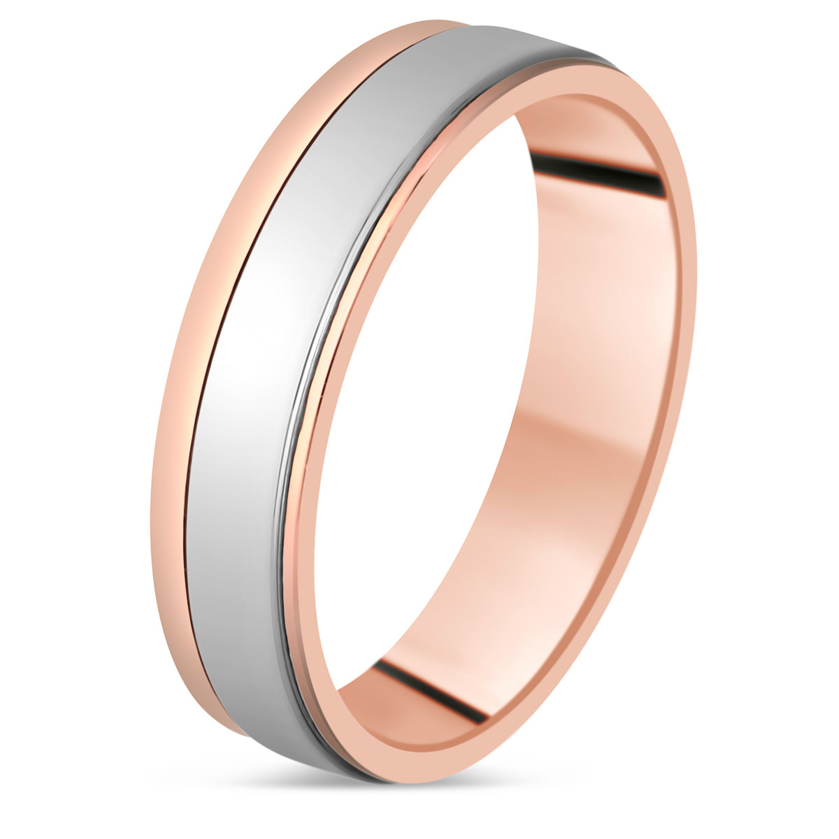 alliance de mariage, bijou de mariage bicolore, bague pour homme ou femme en platine ruban asymetrique sur une base en or rouge