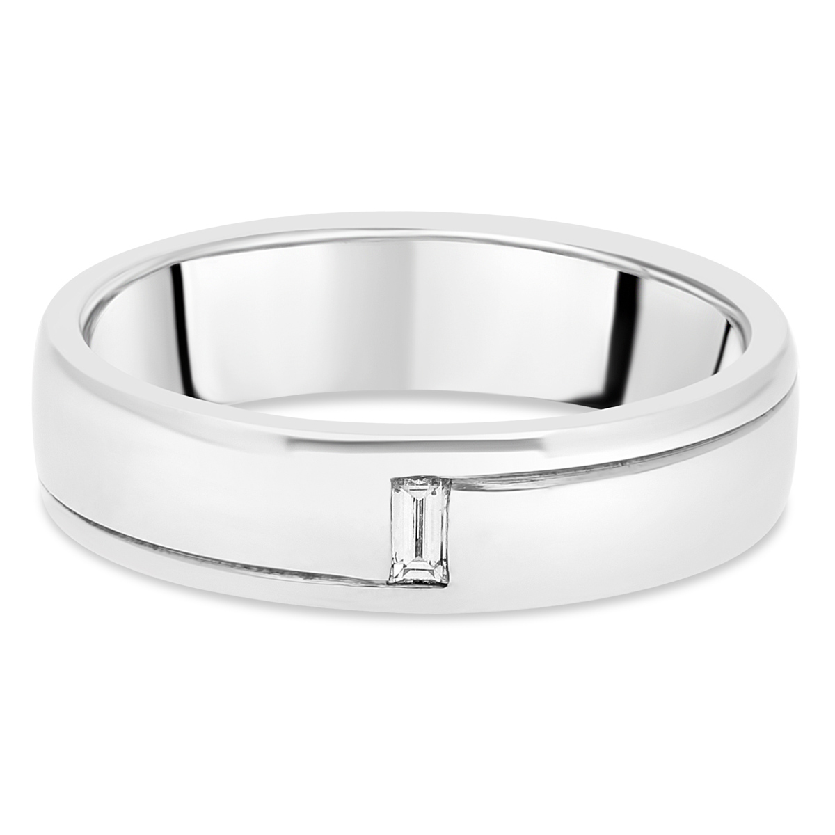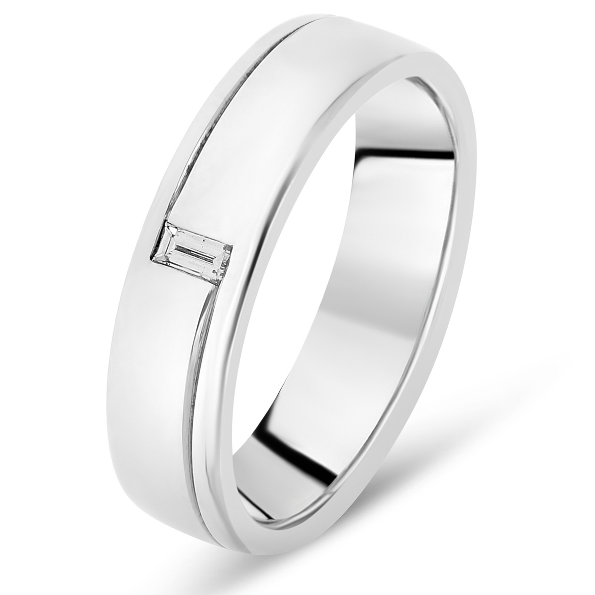 alliance de mariage, bijou diamant, bague diamant pour femme ou homme en platine avec diamant solitaire taille baguette, demi ruban serti clos avec ciselage en spirale
