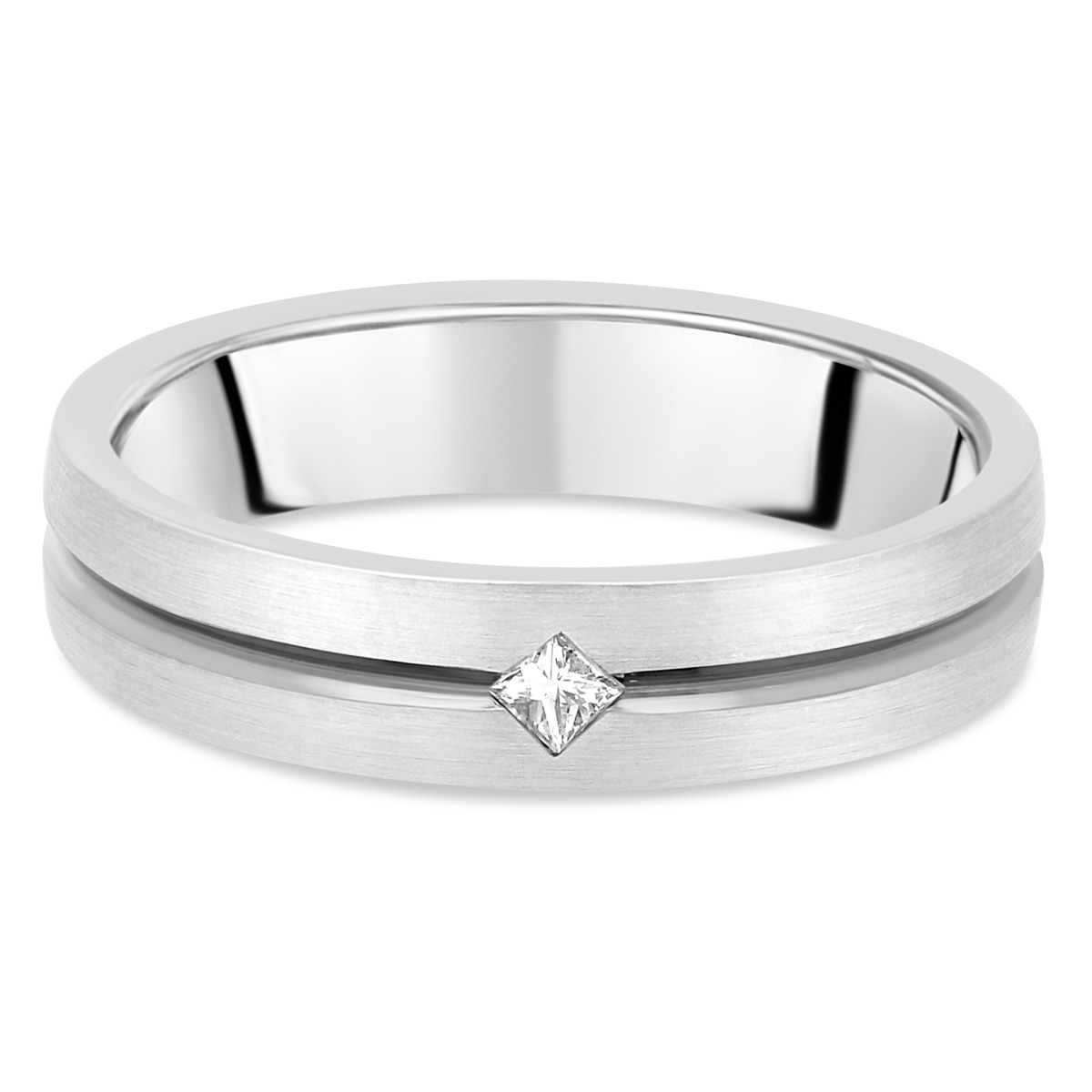 Alliance contemporaine pour homme serti d'un diamant taille princesse de 0.05 carat. Finition extérieure fileté et brossé. Intérieur très bombé pour le confort.