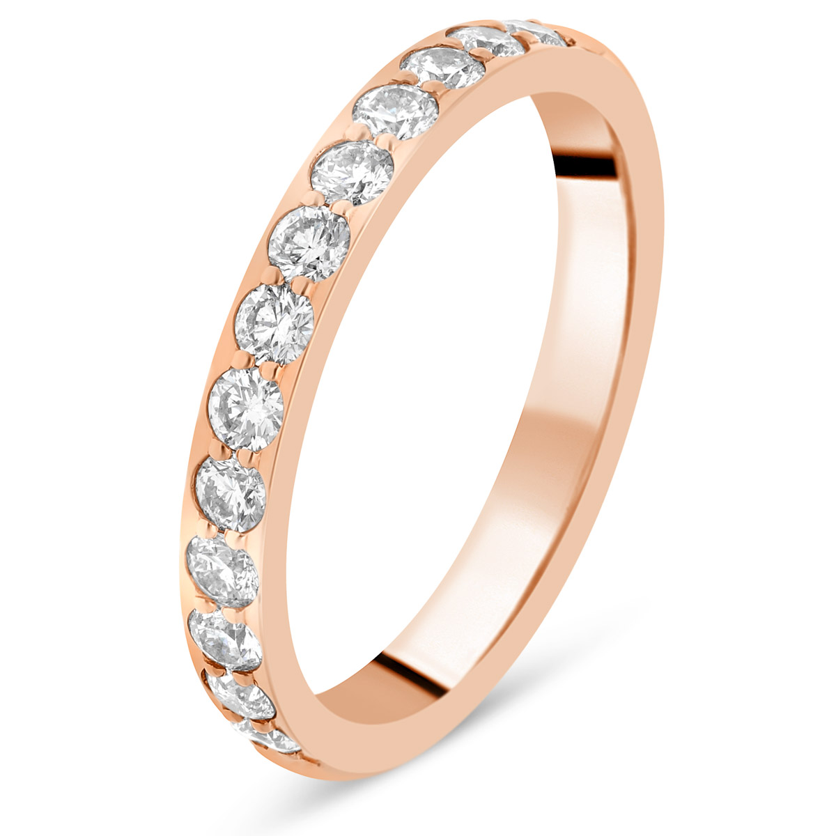 Splendide alliance de mariage pour femme en or rose, avec diamants taille brillant de qualité HSI, tour complet serti 2 mini griffes. Existe en plusieurs versions de 0.66 à 1.68 carats. L'intérieur est massif pour permettre la gravure et arrondi pour plus de confort.