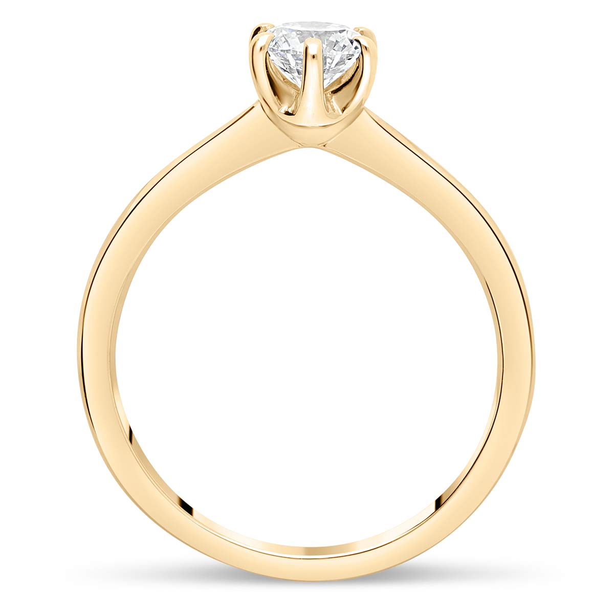 L'anneau en or jaune est lisse et poli, s'affinant délicatement à mesure qu'il s'approche du diamant. Ce détail de conception met en valeur la pierre centrale, la faisant paraître encore plus majestueuse tout en conservant une allure sobre et raffinée.