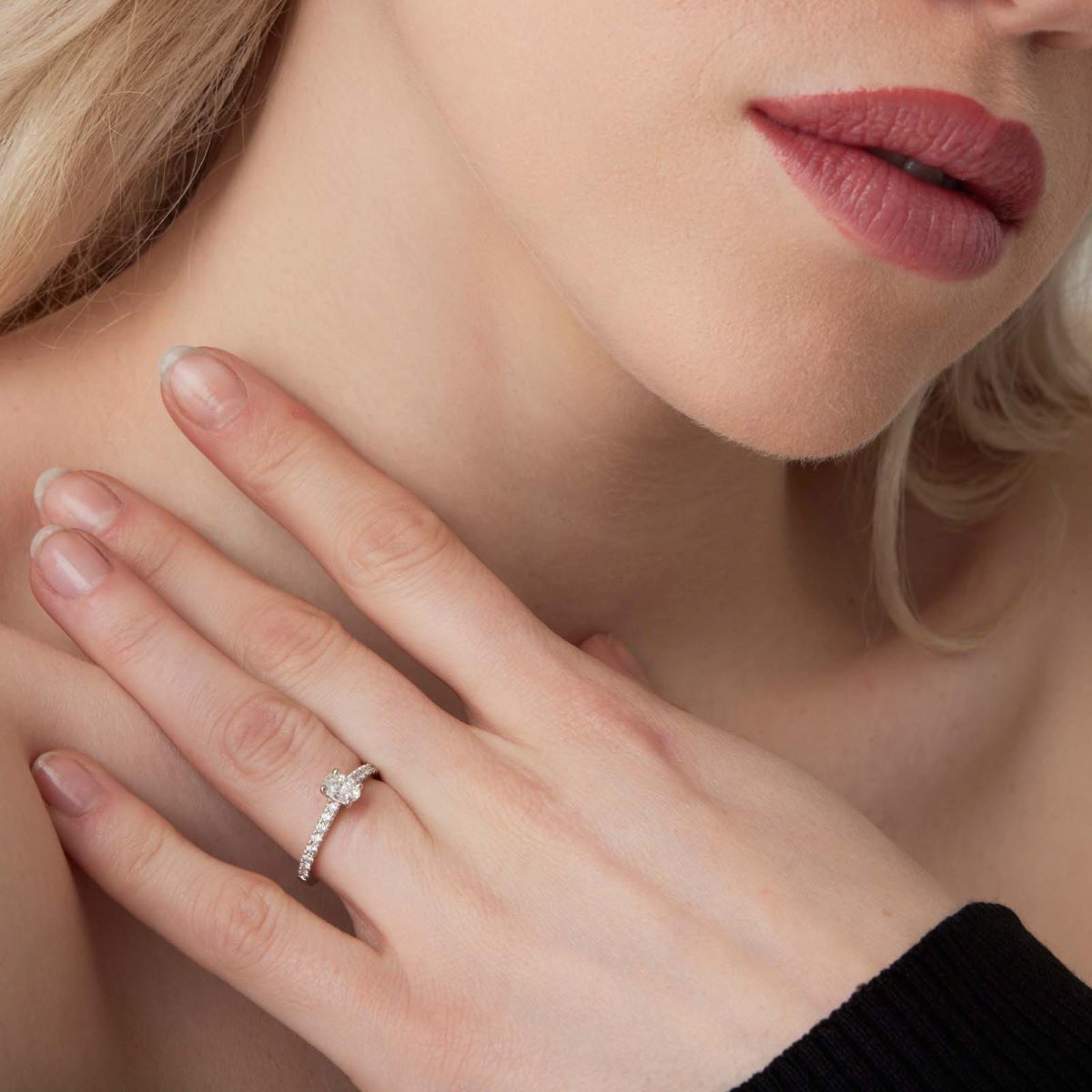 Le diamant central de la bague « Rangiroa » est taillé en ovale qui, grâce à sa forme allongée et ses facettes brillantes, capture la lumière avec une intensité exceptionnelle. L'anneau est serti de petits diamants ronds sur la moitié de son tour, ajoutant une touche de brillance.