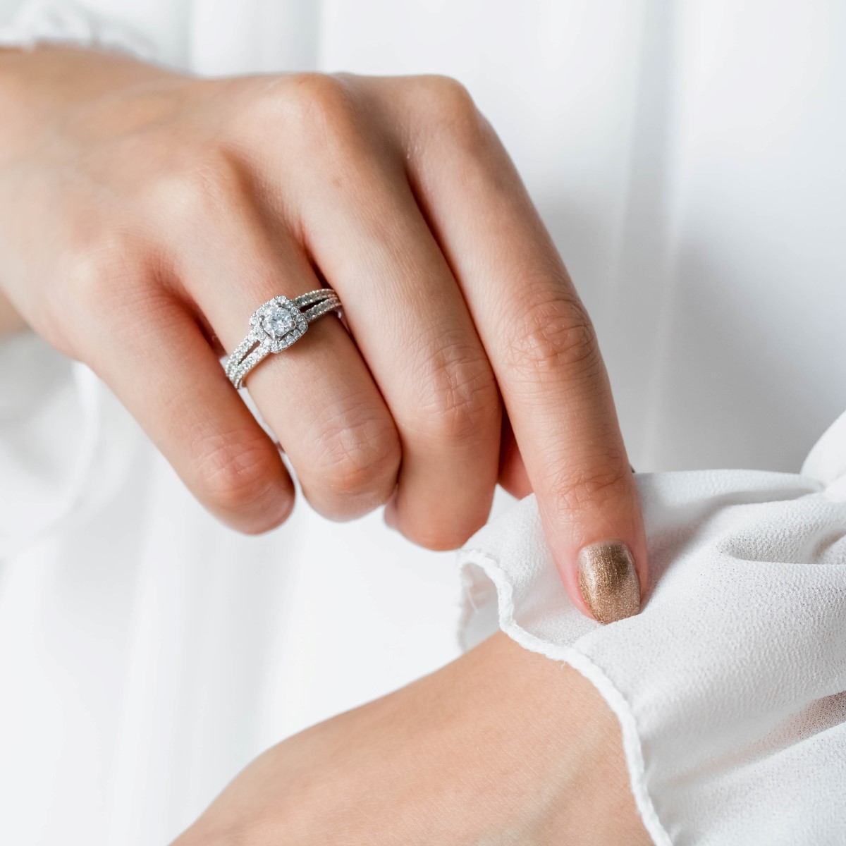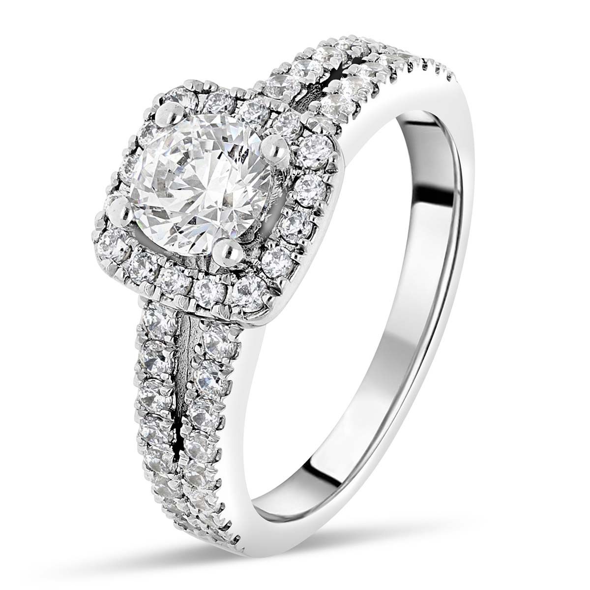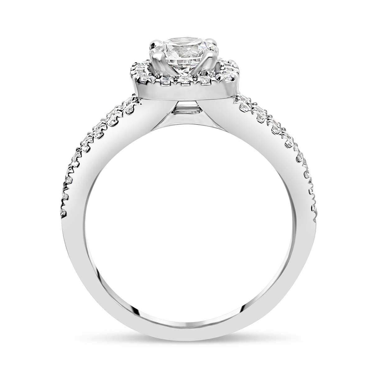 Notre somptueuse bague « Rhodes » met en vedette un diamant central brillant rond, encadré par un halo carré aux coins arrondis de petits diamants. Ce design ingénieux augmente visuellement la pierre centrale et lui donne plus de brillance. L'anneau se divise en deux branches qui s'élancent vers la pierre centrale, chacune sertie de petits diamants en demi-tour.