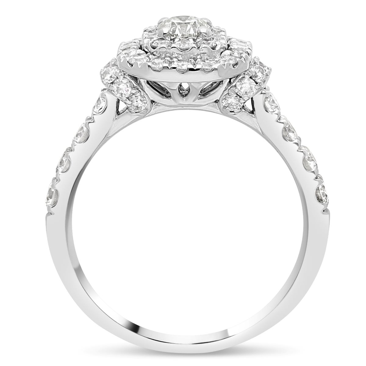 Une bague de fiançailles en or 750 millièmes (18 cts) composée d'un solitaire accompagné d'un pavage de diamants en forme émeraude (la longueur de 11 mm et la largeur est de 9,8 mm) et d'un anneau avec diamants. La largeur de l'anneau est de 2,6 mm. La pierre de centre en diamant est de 0,23ct, les diamants qui subliment le diamant central sont d'un poids total de 0,98 cts et de qualité H (couleur) et SI (pureté).