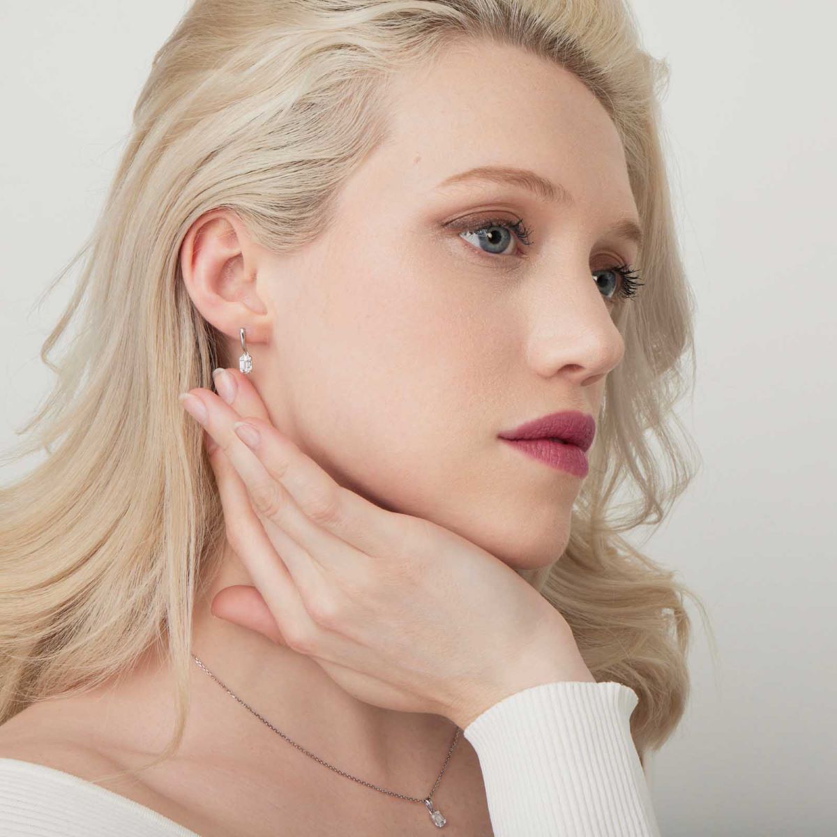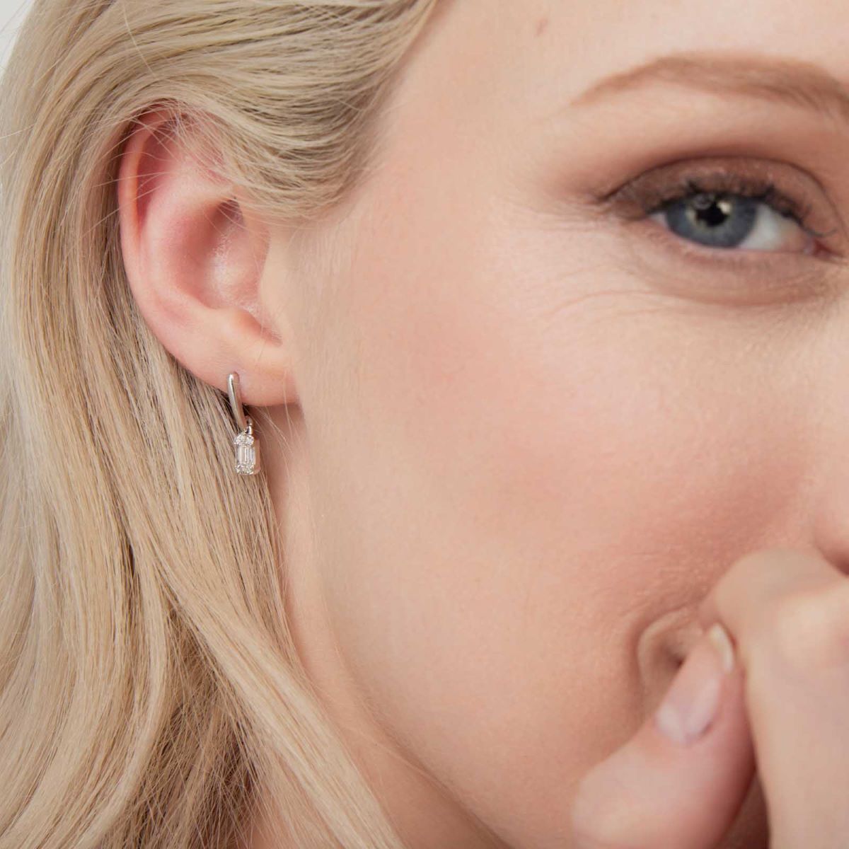 Boucles d'oreilles en or 750 millièmes serties de diamants taille baguette de manière à créer l'illusion d'une taille émeraude. Longueur : 16,2 mm de (avec la bélière) et largeur : 4,7 mm.