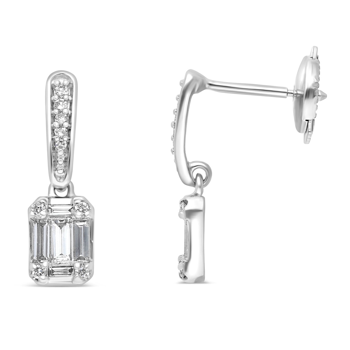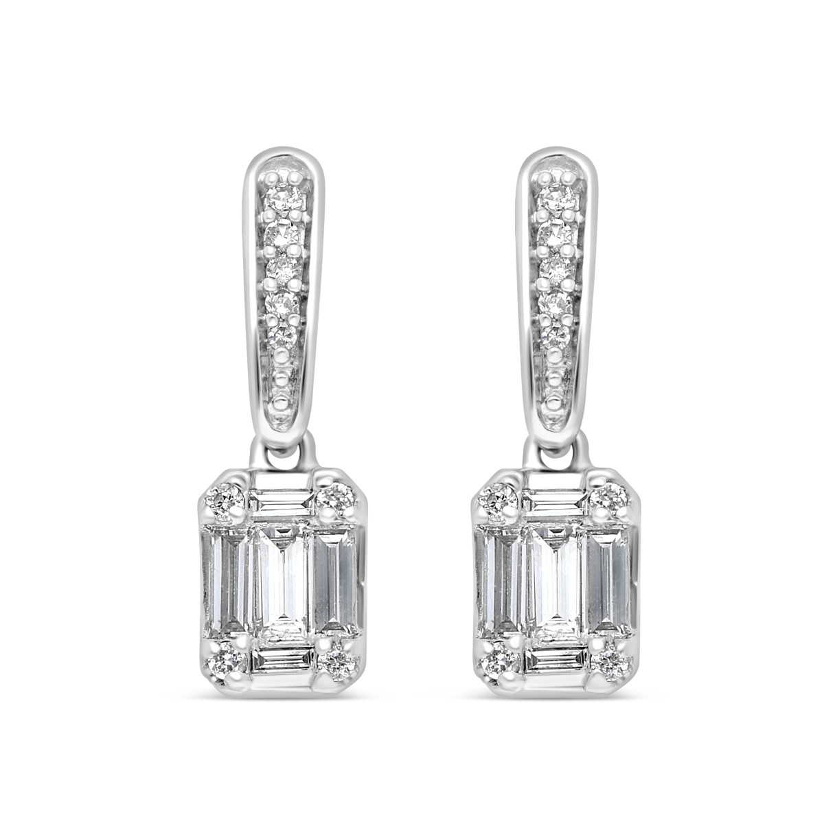Boucle d'oreilles en or 750 millième serties de diamants taille baguette de manière à créer l' illusion d'une taille émeraude. Les dimensions : 16,2 mm de longuer (avec la bélière) et 5 mm de largeur.