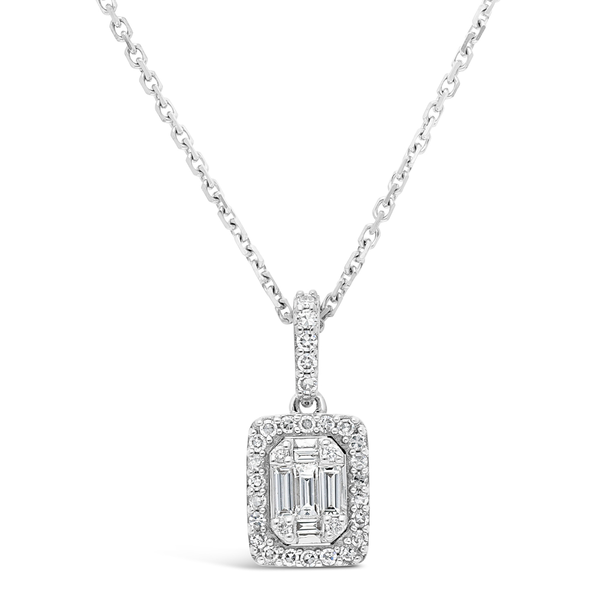 Collier serti de diamants taille baguette de manière à créer l'illusion d'une taille émeraude. La monture et la chaîne sont réalisées en or 750 millièmes.