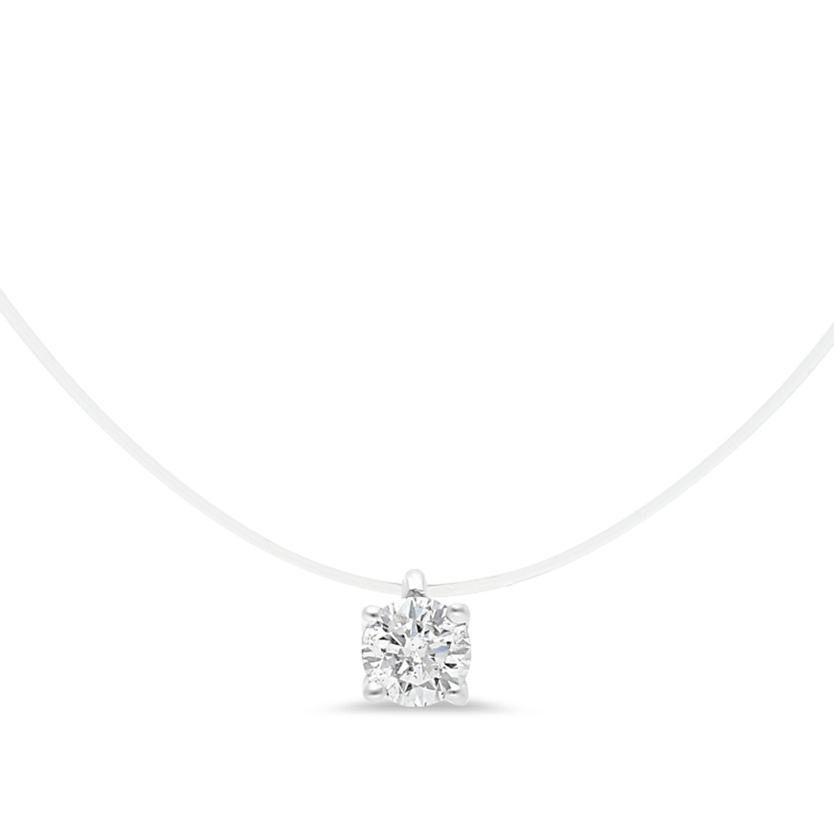 Collier diamant 0,15 HSI serti griffes de 3,5 mm de diamètre, monté en or 750/1000. Le collier est maintenu sur un fil de nylon de 42 cm de longueur.
