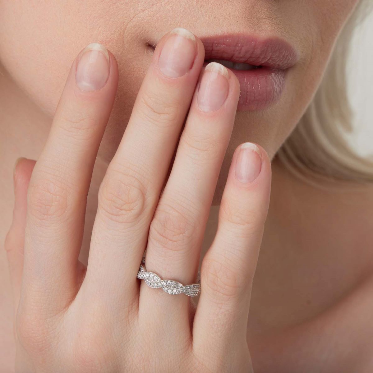 Alliance "Torsadée Diamants" en or blanc 18 carats ornée de pavage de diamants de qualité HSI sertis en demi tour. Ses lignés torsadées en forme de signe de "l'infini" lui confèrent un aspect original chargé de symbolique.