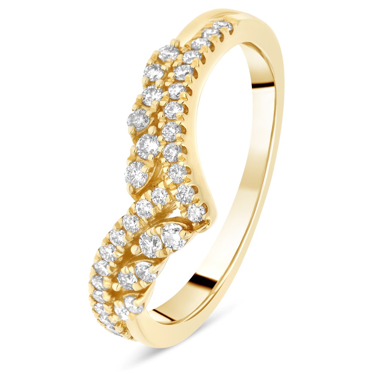 L'alliance la Magistrale en or jaune présente deux rangées de diamants ronds sertis en demi-tour. La largeur de la bague varie de 1.8 mm à 5 mm au centre.