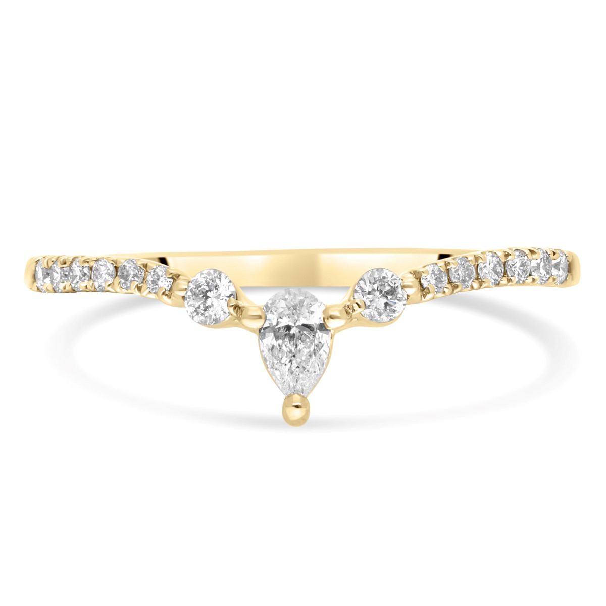 Délicate et charmante, l’alliance La Tiara en or jaune 750 millièmes présente un diamant en forme de poire au centre, entouré de diamants ronds sertis en demi-tour.