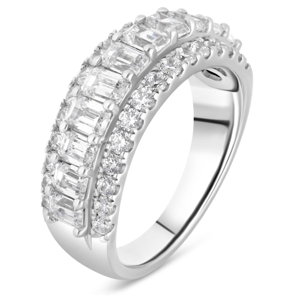 Alliance demi-tour en platine, ornée d'une rangée centrale de diamants émeraudes sublimés par des diamants ronds sur les côtés, se distingue par son éclat raffiné et sa capacité à capturer la lumière sous tous les angles.