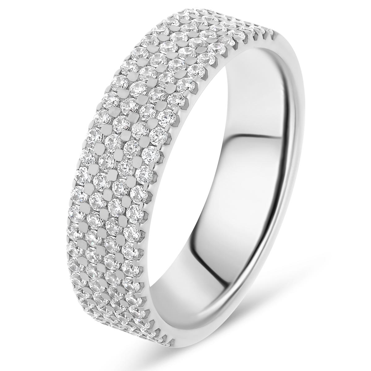 Alliance de mariage contemporaine en platine 950/1000 sertie en demi tour de diamants de qualité HSI en quatre rangs. Le modèle se décline en trois largeurs / poids carat allant de 5,4 mm (ou 0,5 carats) à 6,5 mm (0.8 carats). Existe aussi en deux ou trois rangs.