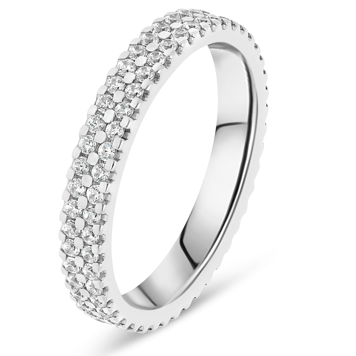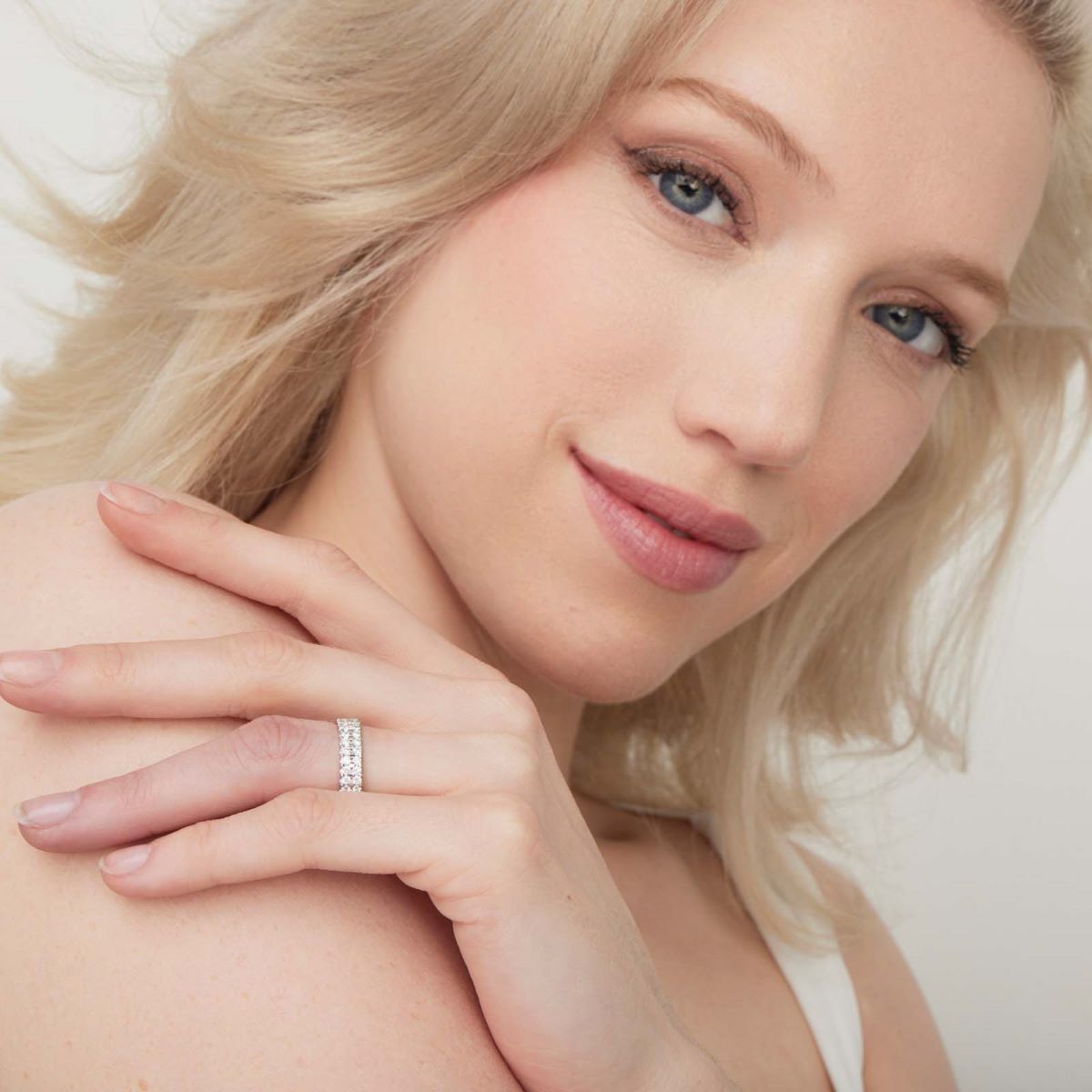 Précieuse et intemporelle, cette alliance en or blanc 750 est sertie de diamants en tour complet, offrant une brillance continue sous tous les angles. Les pierres sont délicatement disposées en deux rangs étroits et parfaitement distincts, créant un effet structuré plus affirmé qu’un pavage classique.