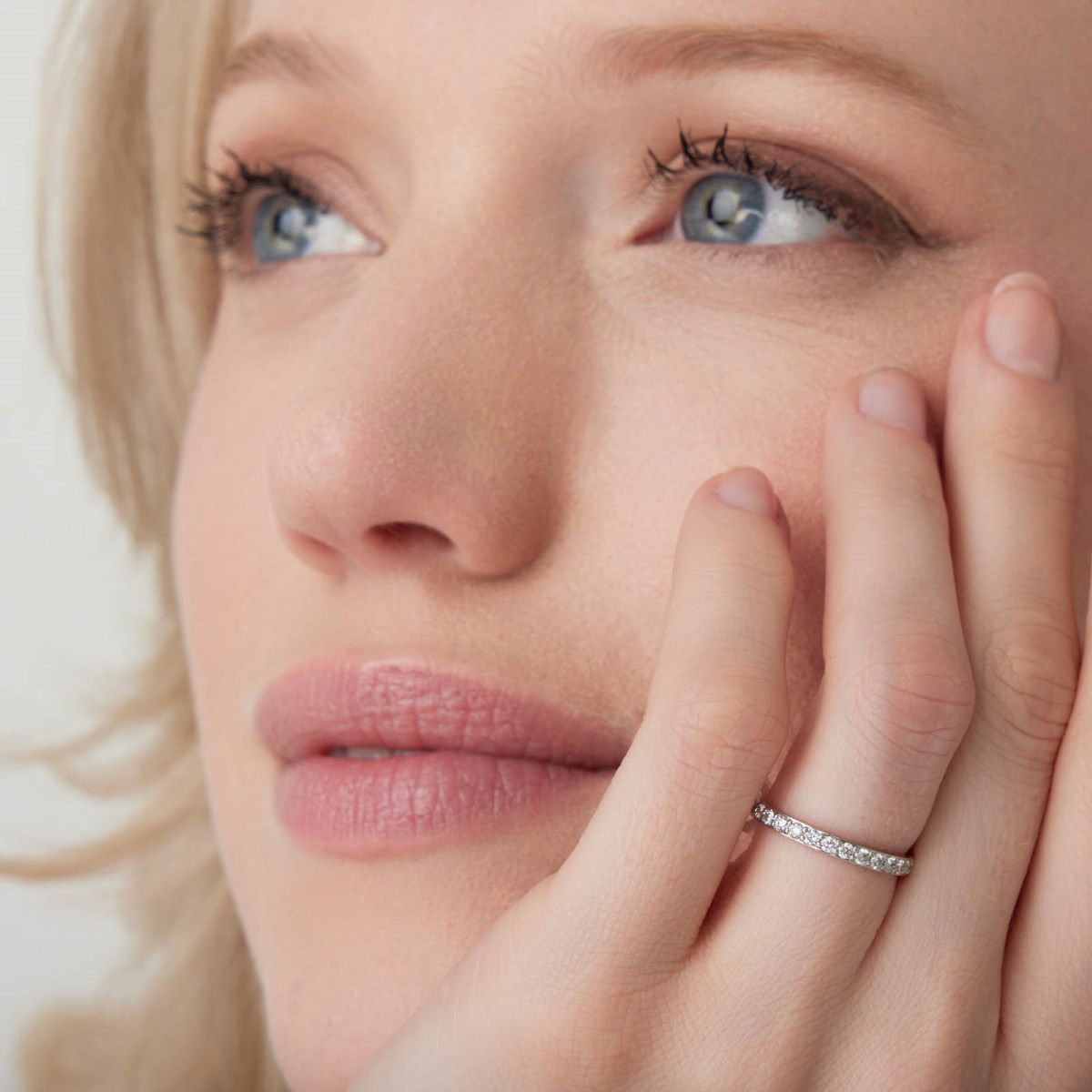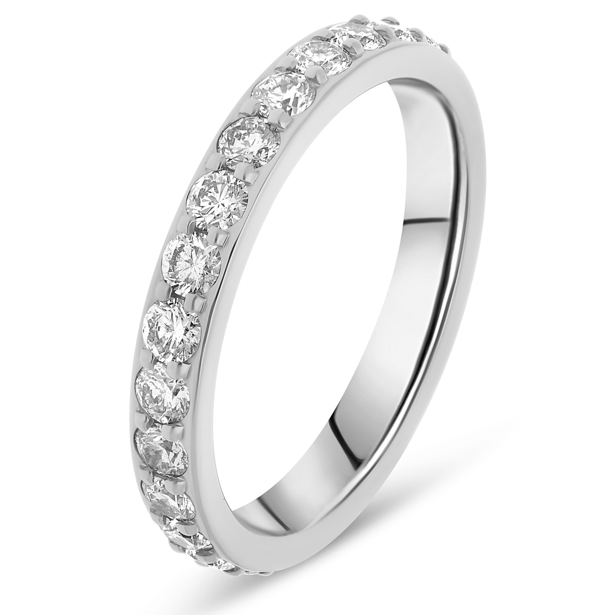 Splendide alliance de mariage Tour Complet Diamants pour femme en platine. La bague est sertie de diamants taille brillant de qualité HSI, tour complet en 2 mini griffes. Existe en plusieurs versions de 0.66 à 1.61 carat. L'intérieur est massif pour permettre la gravure et arrondi pour plus de confort.