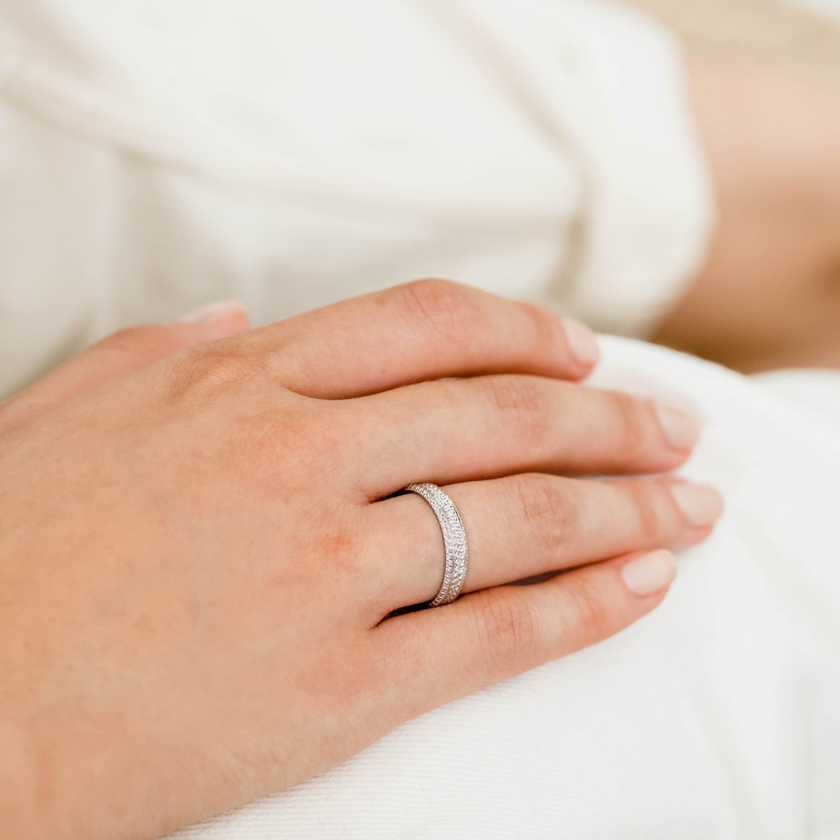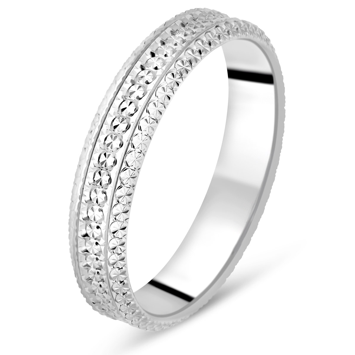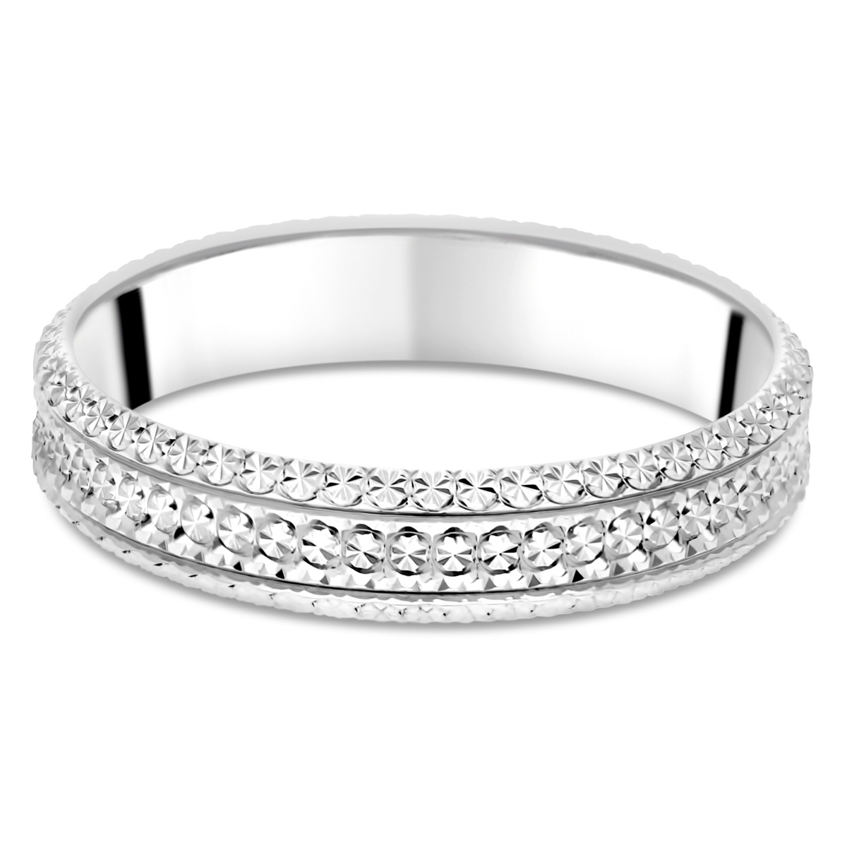 Élégante et contemporaine, cette alliance en or blanc se distingue par son motif ciselé effet diamanté, conçu pour capter la lumière et révéler un éclat subtil à chaque mouvement. Sa forme légèrement concave au centre apporte du relief et un confort naturel au porté, tout en modernisant le design classique de l’anneau.
