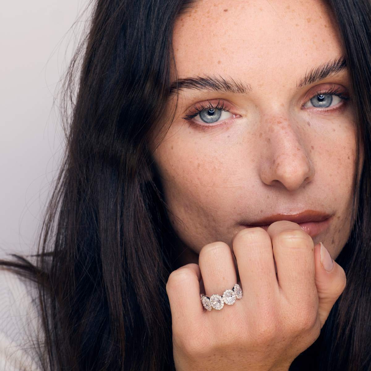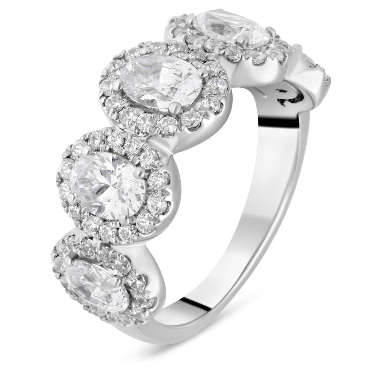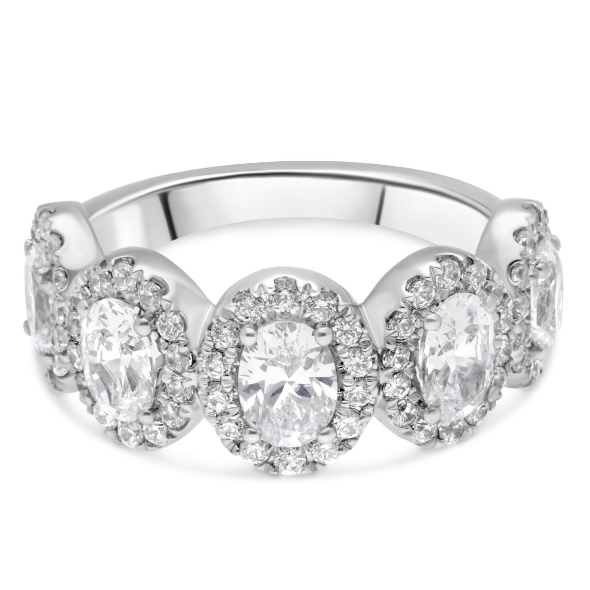 L'alliance demi-tour Zeralda en platine, fusionne l'élégance et la sophistication. Elle met en valeur cinq magnifiques diamants ovales entourés de petits diamants ronds, qui forment un halo scintillant.