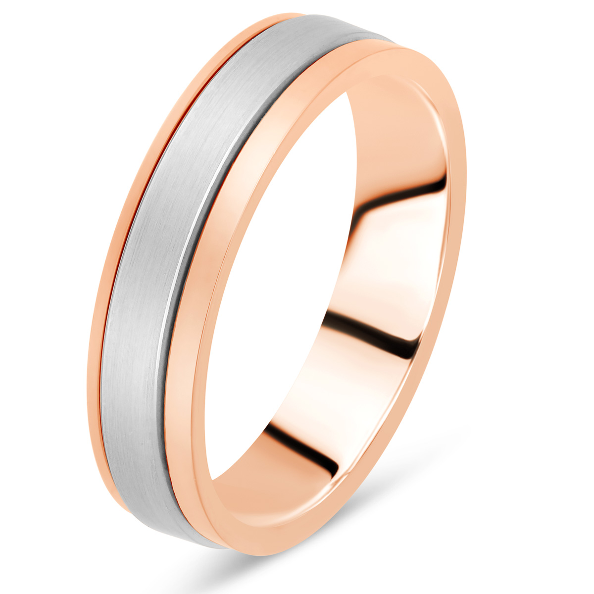 Une alliance bicolore pour homme ou femme composée d'un anneau en platine soudé sur une base en or rouge 18 carats. De type ruban, à la finition brossée pour un aspect mat, aux bords en or rouge droits et asymétriques, cette alliance est disponible en 2 largeurs : 4,5 mm et 5,5 mm.