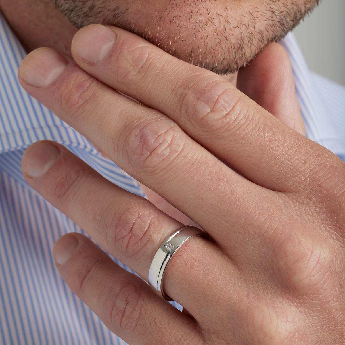 alliance de mariage, bijou diamant, bague diamant pour femme ou homme en platine avec diamant solitaire taille baguette, demi ruban serti clos avec ciselage en spirale