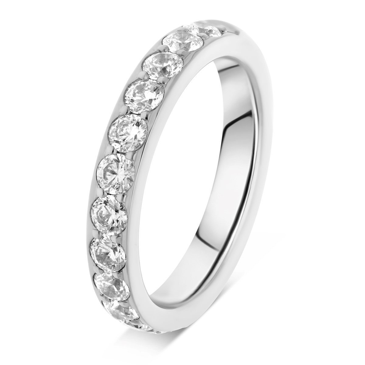 Sublime alliance de mariage pour femme en or blanc 750/1000, avec diamants taille brillant de qualité HSI, demi tour serti mini griffes. Existe en plusieurs versions de 0.34 à 0.84 carat. L'intérieur est massif pour permettre la gravure et arrondi pour plus de confort.