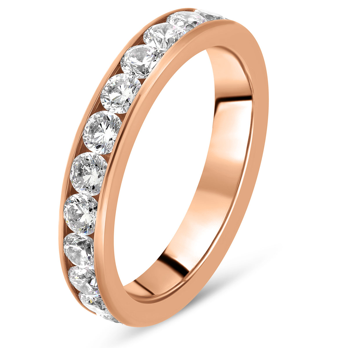 Élégante alliance de mariage Diamants Tour Complet pour femme en or rose, avec diamants taille brillant de qualité HSI ou GVS, enchâssés dans un rail fin. Cette bague existe en plusieurs versions de 0.50 à 1 carats. L'intérieur est massif pour permettre la gravure et arrondi pour plus de confort.