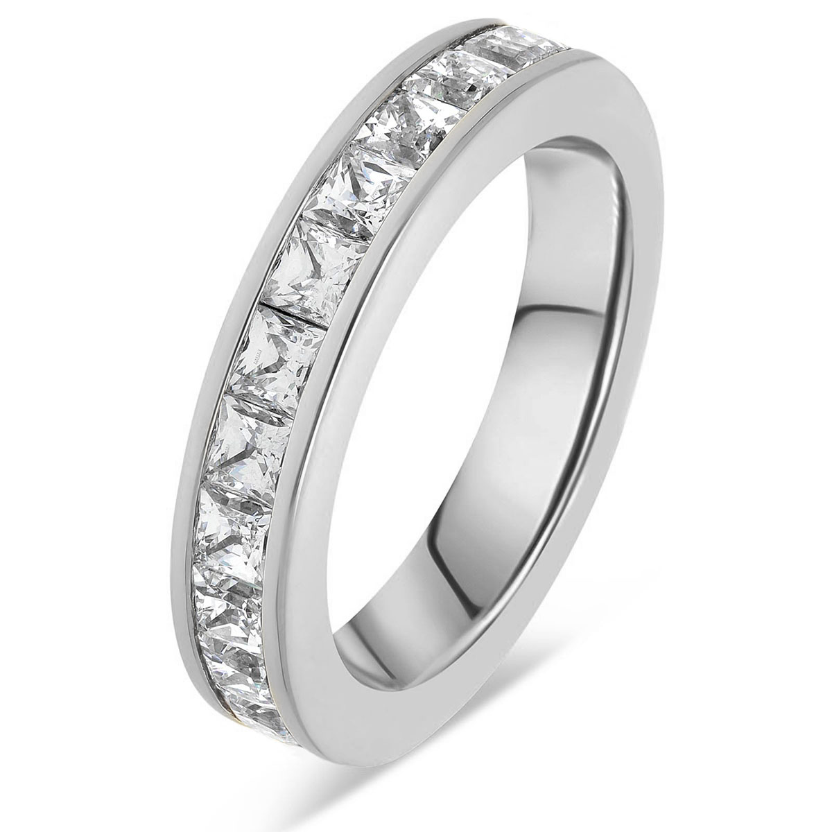 Moderne, intemporelle et simplement sublime, cette alliance pour femme est sertie en tour complet de diamants taille princesse. Seuls des diamants de couleur G et de pureté VS sont capables de lui donner tout son éclat, étincelle, feu et brillance. Les diamants sont enchâssés dans de fins rails de métal. Cette alliance se décline en plusieurs versions de poids carat. Vous pouvez également choisir entre platine, or blanc ou or jaune 18 carats.