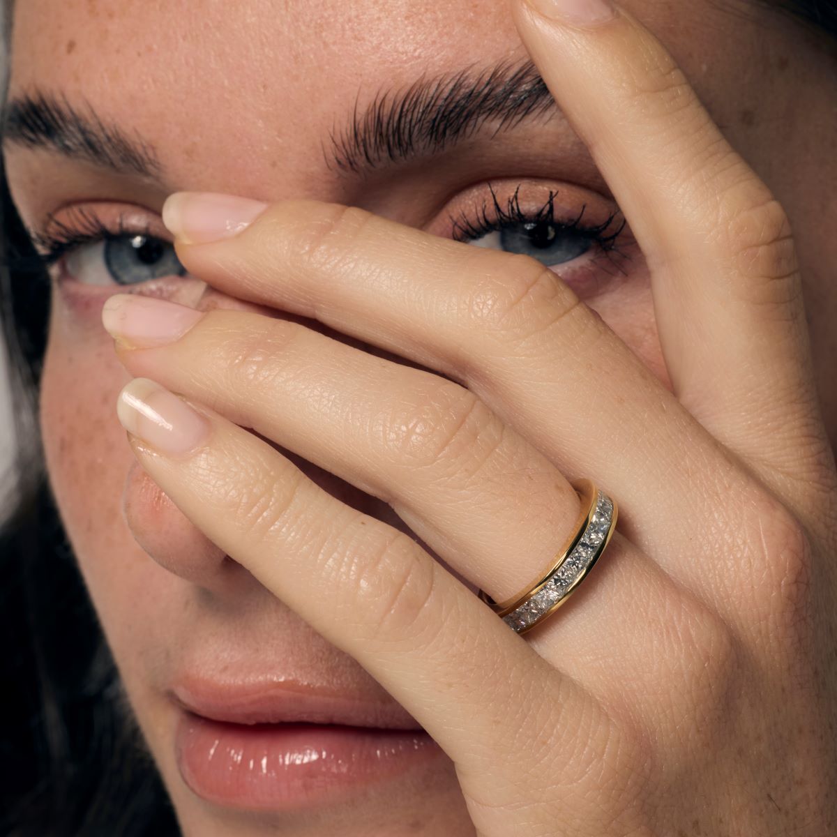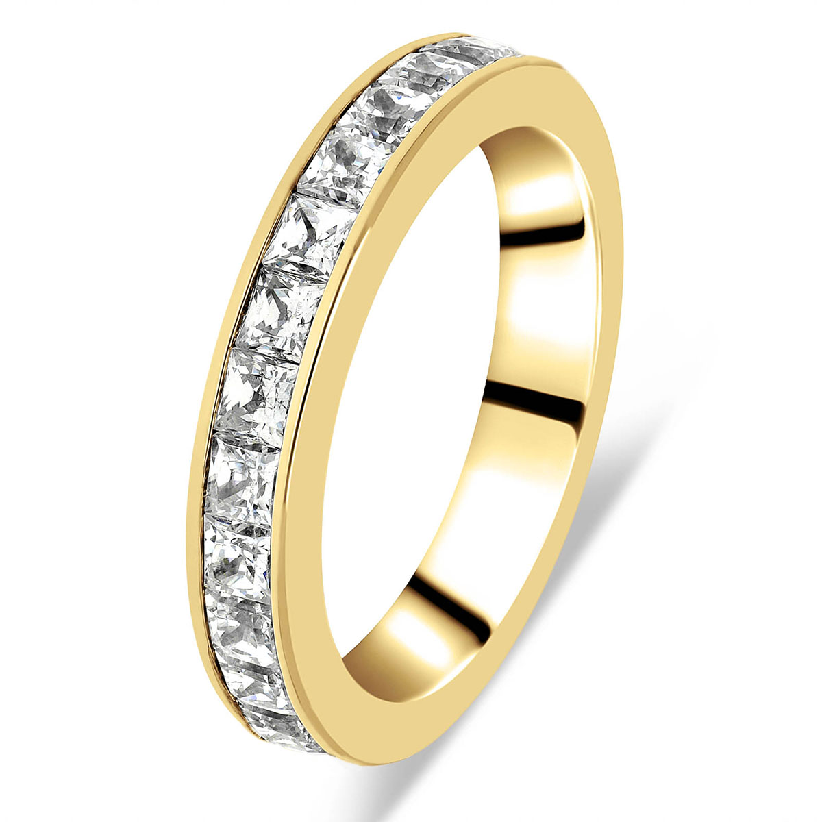 Moderne, intemporelle et simplement sublime, cette alliance pour femme est sertie en tour complet de diamants taille princesse. Seuls des diamants de couleur G et de pureté VS sont capables de lui donner tout son éclat, étincelle, feu et brillance. Les diamants sont enchâssés dans de fins rails de métal. Cette alliance se décline en plusieurs versions de poids carat. Vous pouvez également choisir entre platine, or blanc ou or jaune 18 carats.
