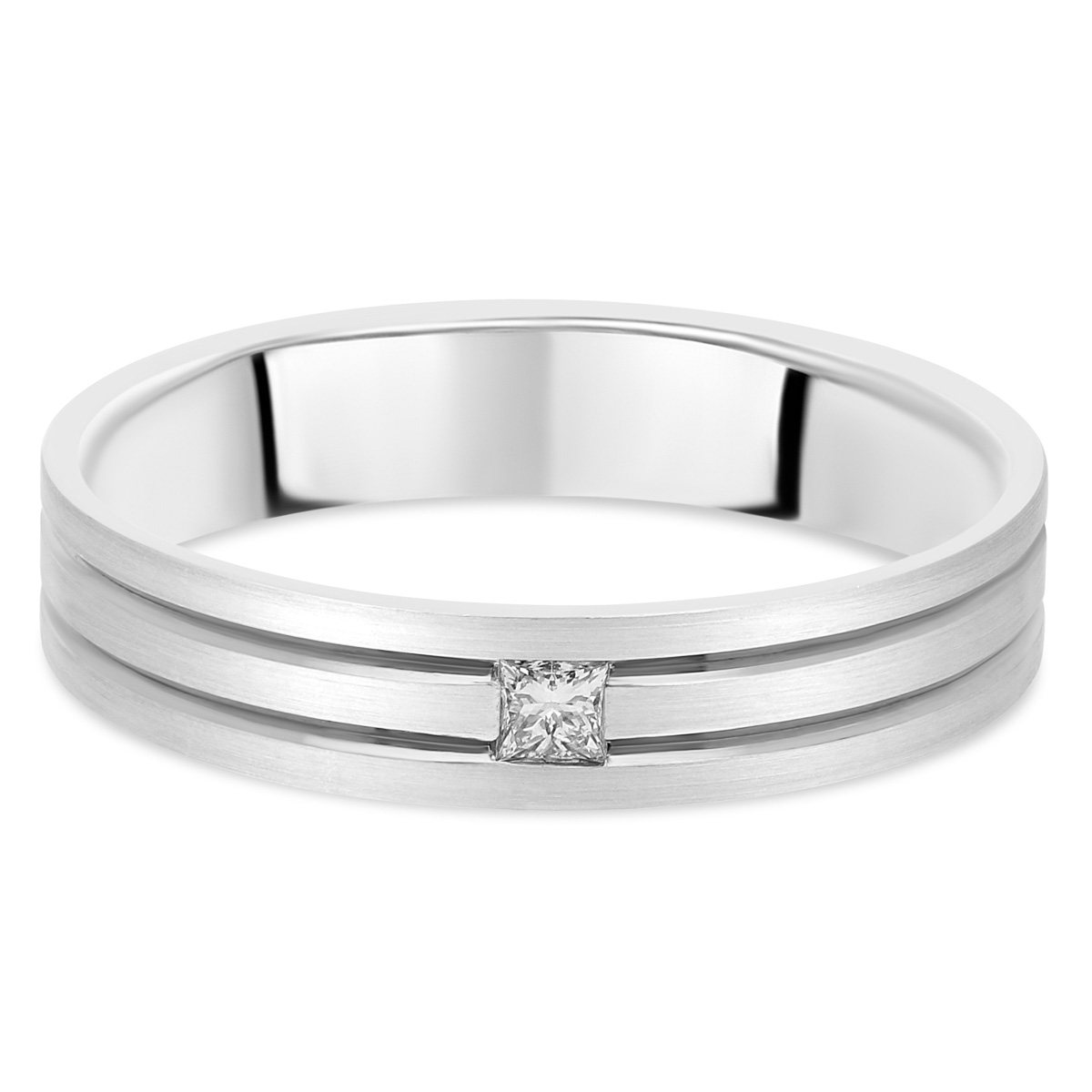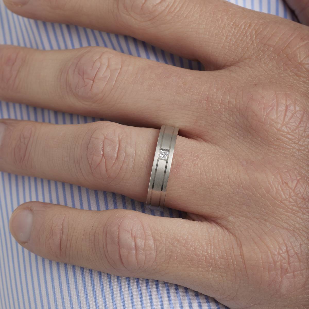 Alliance homme contemporaine sertie d'un diamant princesse de 0.10 ct. Finition extérieure polie brillante filetée.