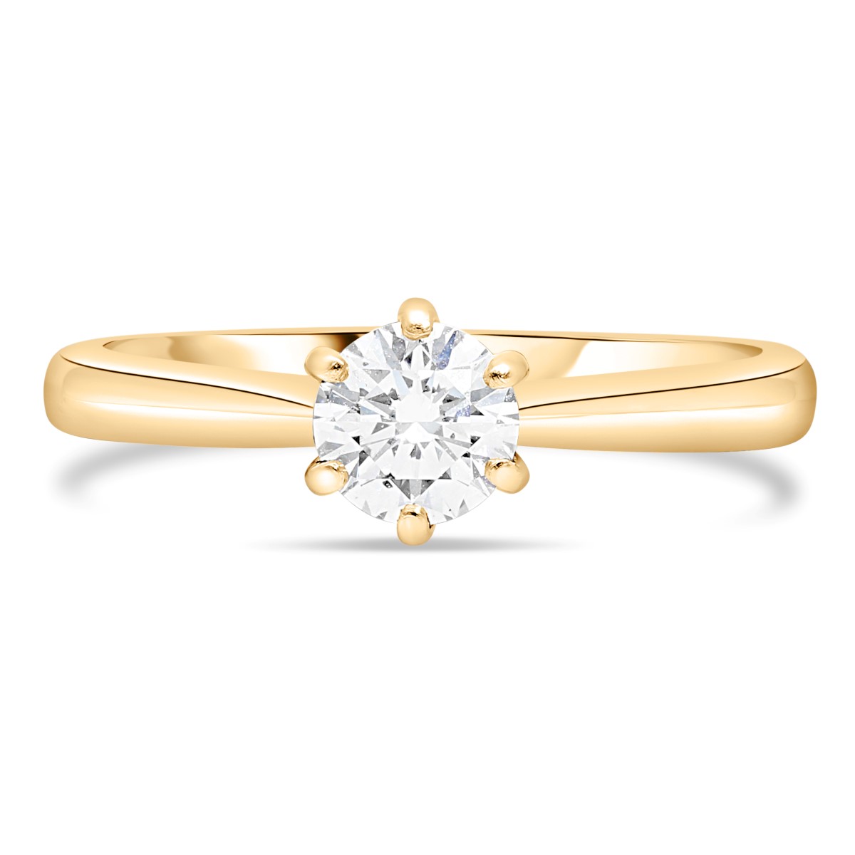 L'anneau en or jaune est lisse et poli, s'affinant délicatement à mesure qu'il s'approche du diamant. Ce détail de conception met en valeur la pierre centrale, la faisant paraître encore plus majestueuse tout en conservant une allure sobre et raffinée.