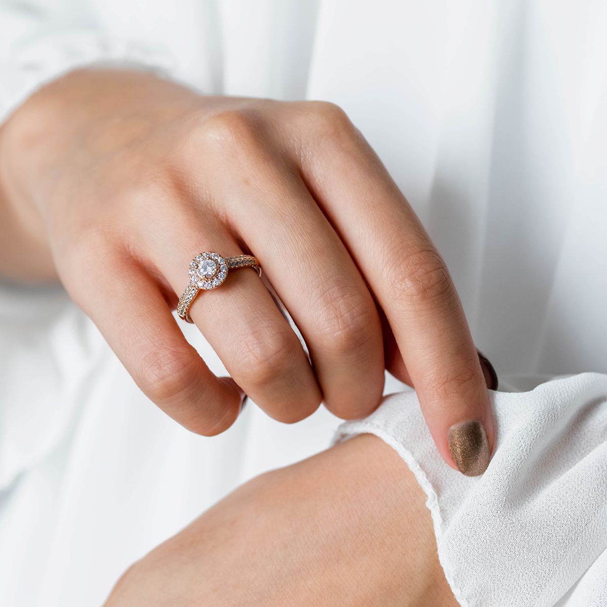 Bague de fiançailles ornée d'un diamant de 0,20 carat HSI maintenu par 4 griffes et entouré de diamants sertis en mini griffes. La partie supérieure de l'anneau est parée de petits brillants sertis sur deux 2 rangs. Le diamètre au centre est de 8 mm. La largeur de l'anneau est de 2,7 mm.