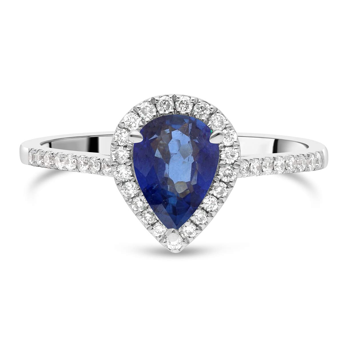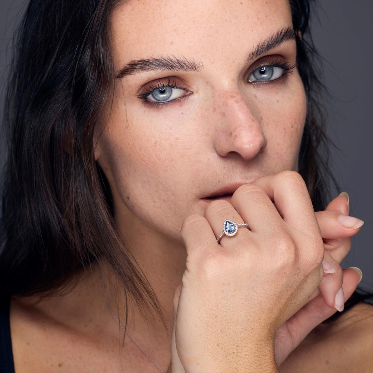 Bague de fiançailles ornée d'un saphir central taillé en poire inséré dans un halo de diamants HSI. L'anneau en or 18 carats (750/1000) est serti de diamants HSI en demi tour.