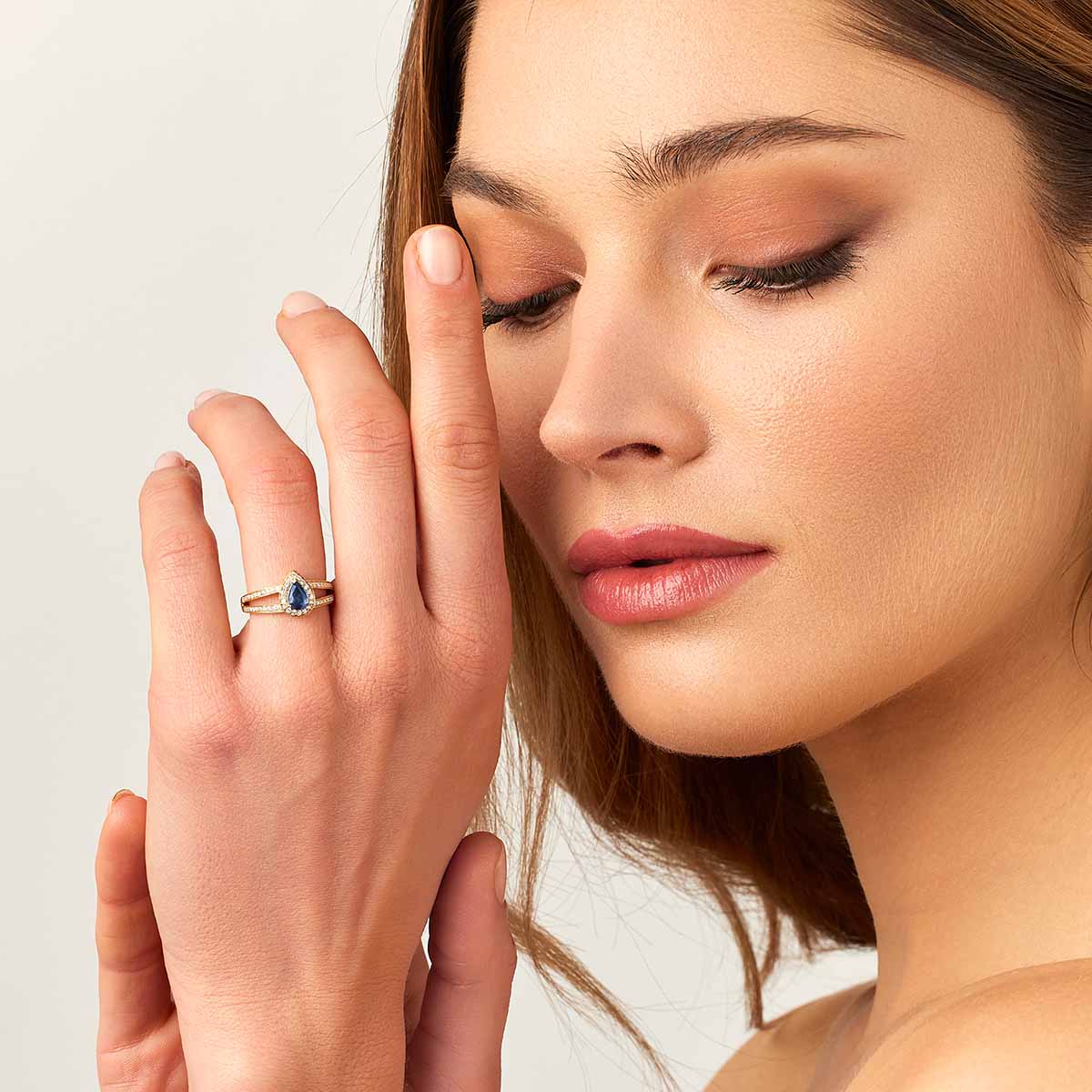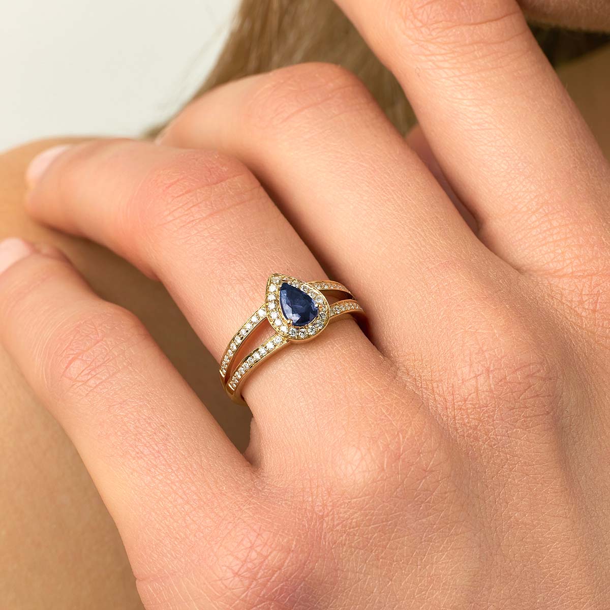 Une bague de fiançailles sertie d'un saphir taille poire. La pierre centrale est enserrée dans une monture en or 18 cts ornée de diamants HSI de 0,26 cts. Ses dimensions : 9,4 mm au centre et 2,6 mm au point le plus fin de l'anneau.