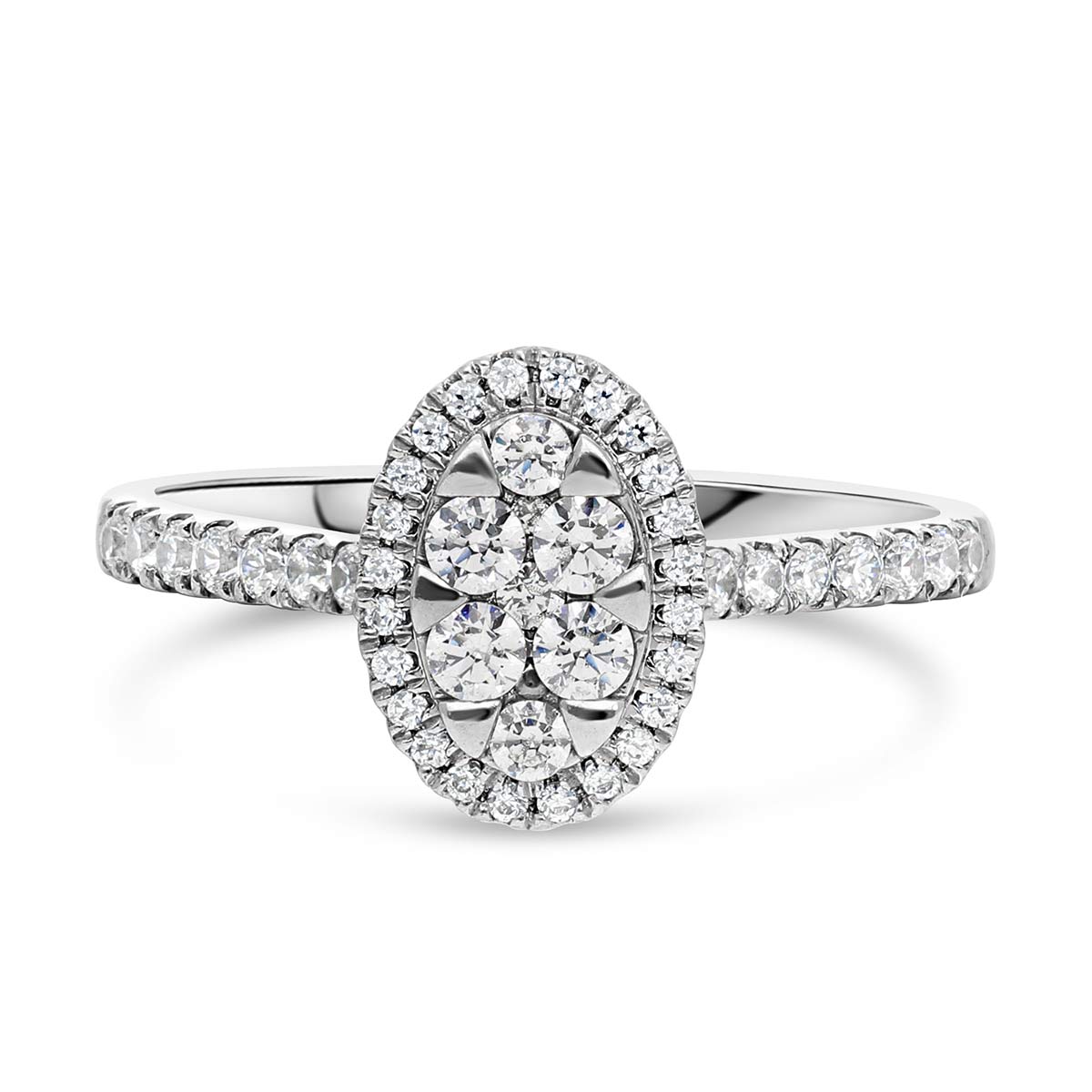 Bague de fiançailles en or 750/1000 ornée d'un pavage ovale de diamants HSI au centre. Des diamants sont également sertis sur la partie supérieure de l'anneau. Le poids total de diamant est de 0,48 ct. Les dimensions de la bague sont de 10,8 mm sur 6,6 mm au centre et 2 mm à l'anneau.