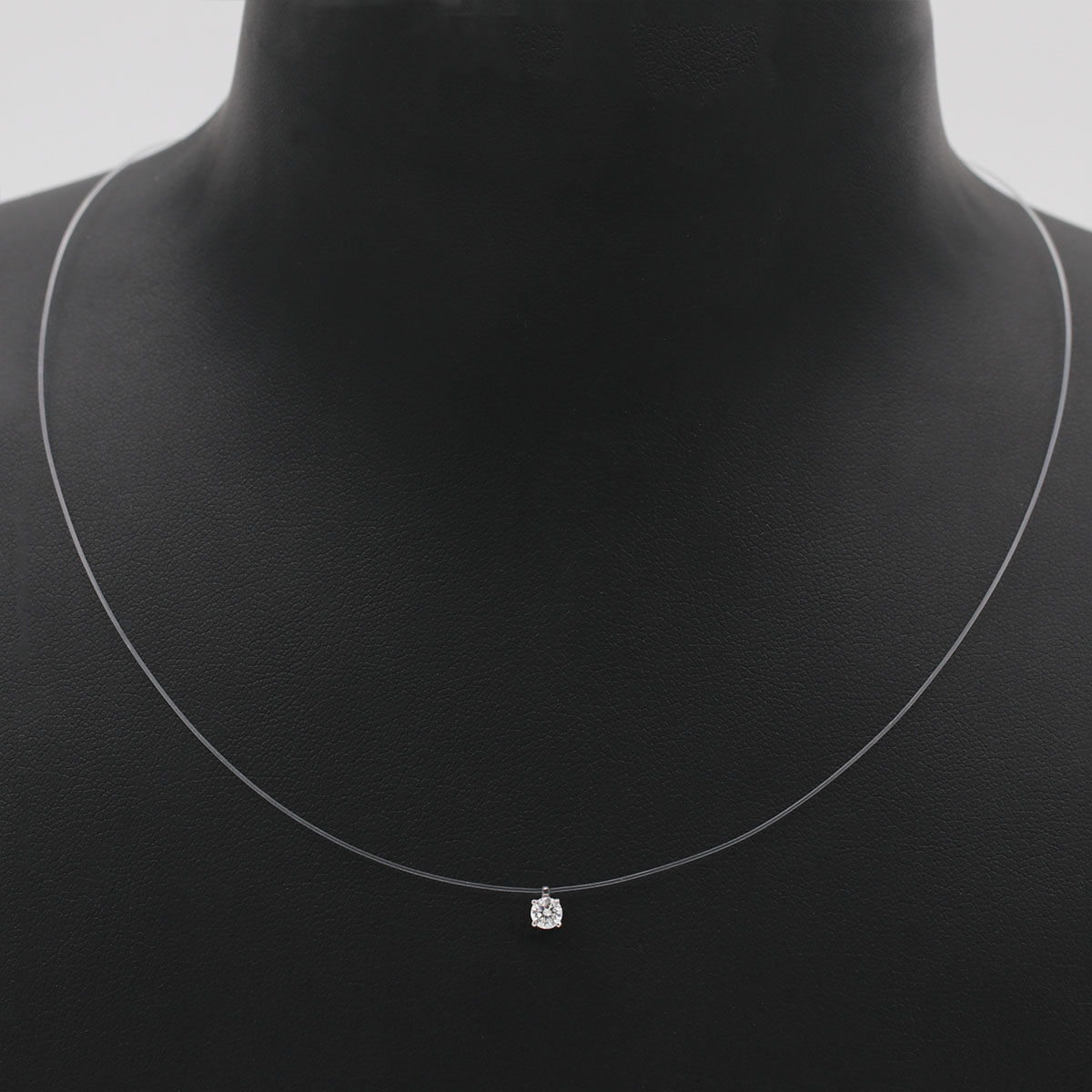 Collier diamant 0,15 HSI serti griffes de 3,5 mm de diamètre, monté en or 750/1000. Le collier est maintenu sur un fil de nylon de 42 cm de longueur.
